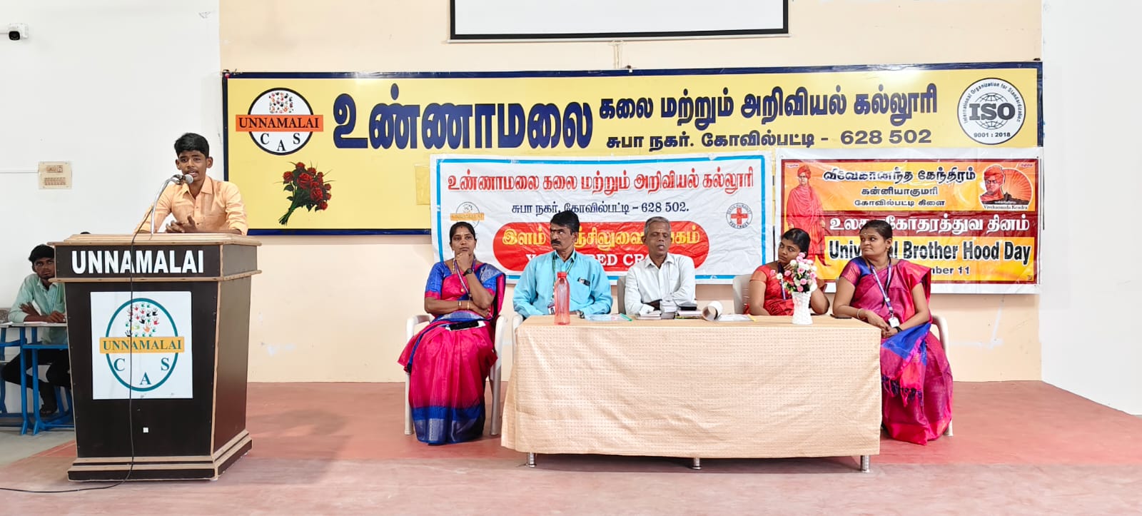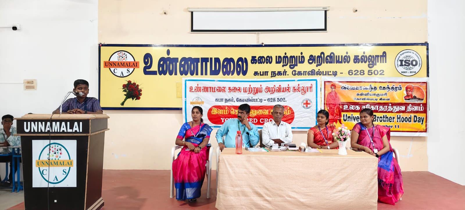 கோவில்பட்டி, உண்ணாமலை கலை மற்றும் அறிவியல் கல்லூரி இளம் செஞ்சிலுவைச் சங்கம் (YRC) மற்றும் விவேகானந்த கேந்திரம் இணைந்து உலக சகோதரத்துவ தின விழா அனுசரிக்கப்பட்டது.
