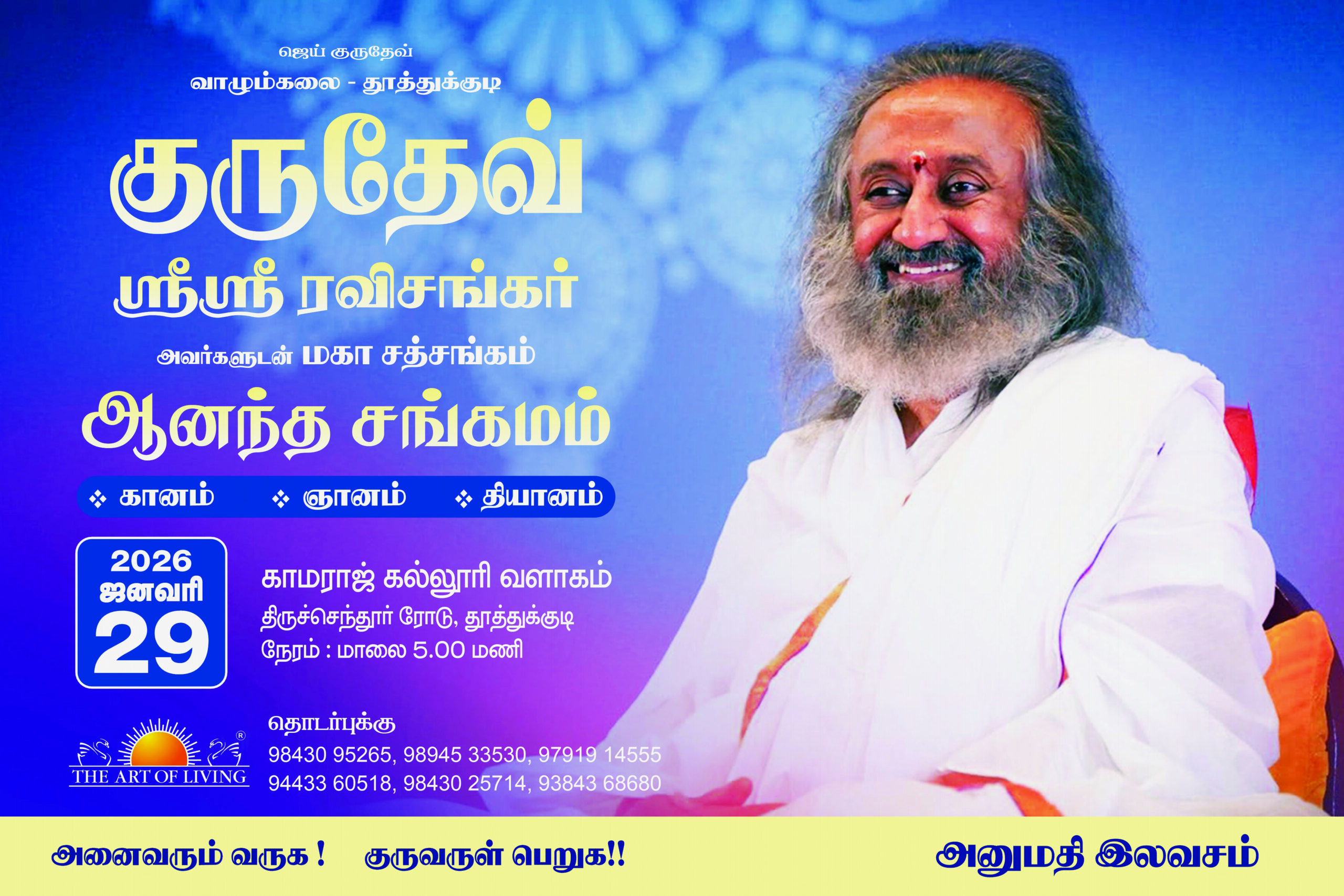 நிகழ்ச்சி தூத்துக்குடி காமராஜ் கல்லூரி வளாகத்தில் இன்று 29 – 01 – 2026 வியாழக்கிழமை மாலை 5.00 மணிக்கு நடைபெற இருக்கிறது. அனுமதி இலவசம். அனைவரும் வருகை புரிந்து குரு அருள் பெற அழைக்கிறோம்.