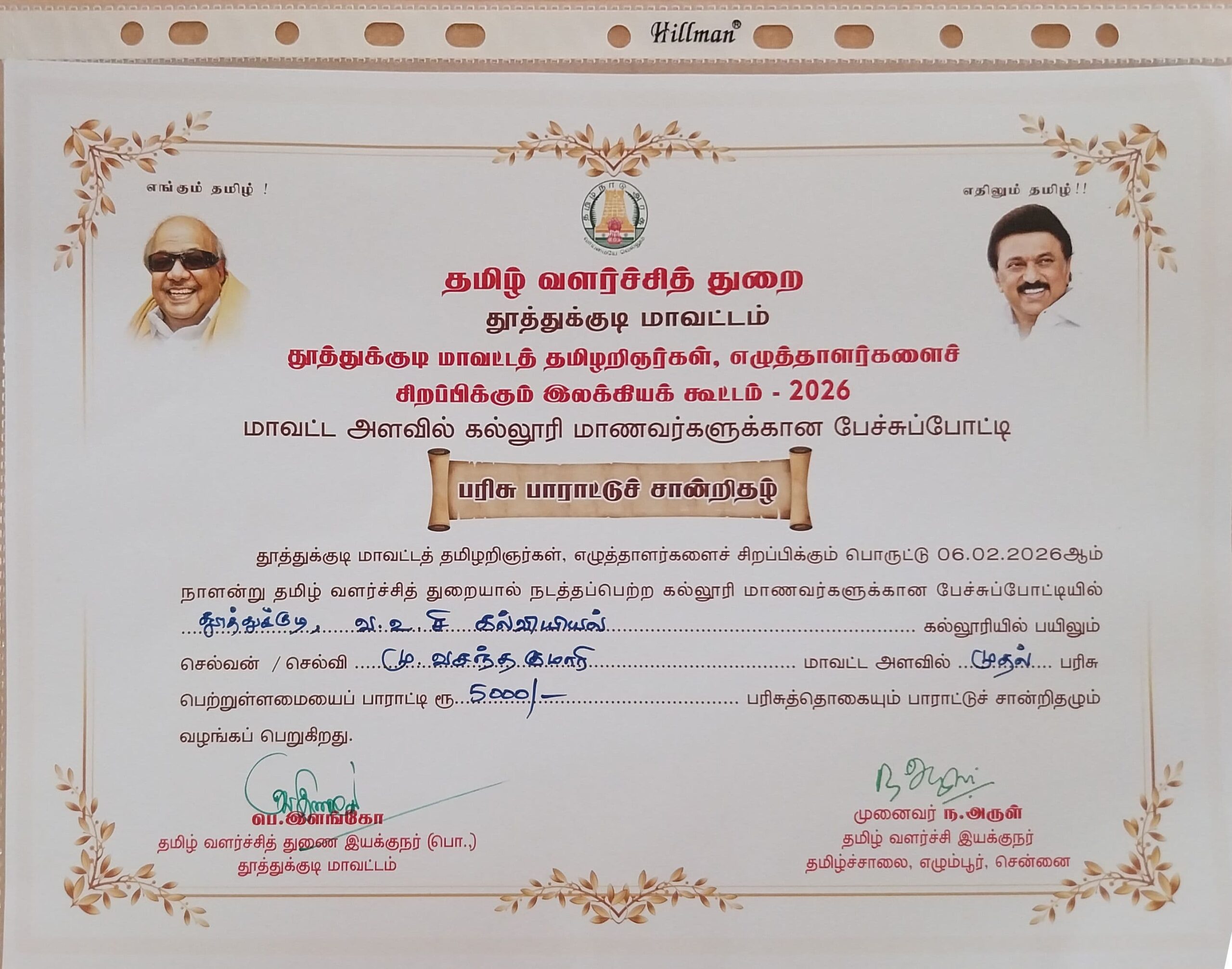 தமிழ்நாடு அரசின் தமிழ் வளர்ச்சி துறை நடத்திய மகாகவி பாரதியார், வ உ சிதம்பரம், கிரா, இளசை மணியன் போன்ற தமிழறிஞர்களின் இலக்கியப்பணி மற்றும் தமிழ் தொண்டினை நினைவு கூறி போற்றும் வகையில் மாவட்ட அளவிலான பேச்சுப் போட்டி 06.02.2026 அன்று காமராஜ் கல்லூரியில் நடத்தப்பெற்றது.