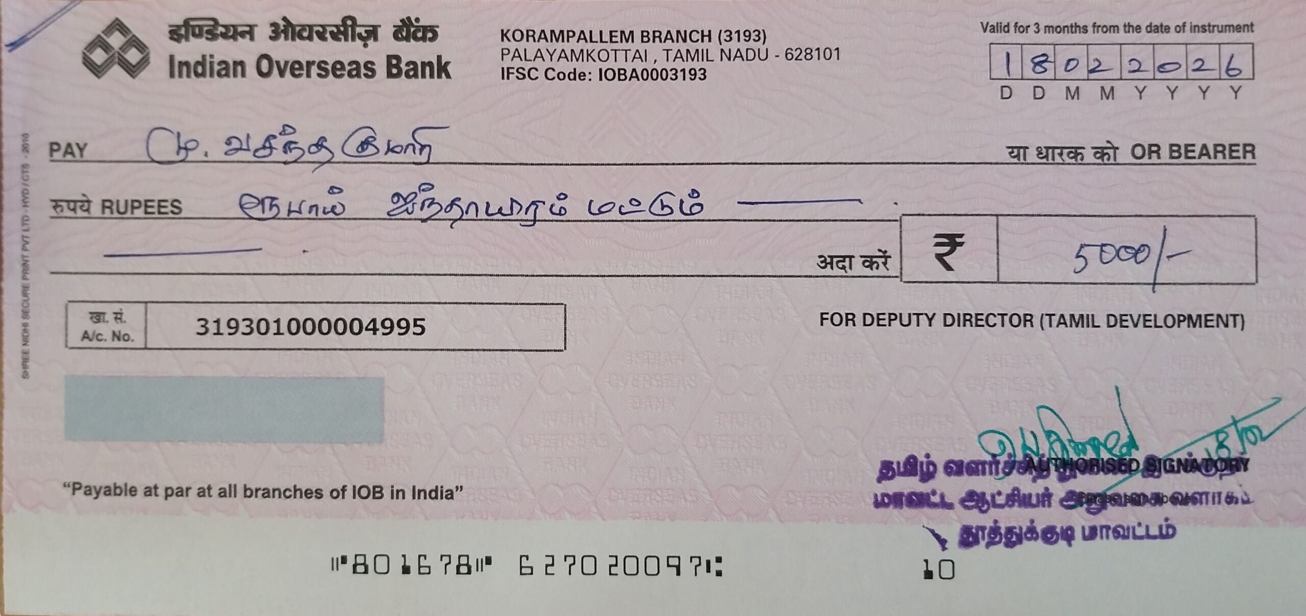 மாணவி வசந்தகுமாரிக்கு தூத்துக்குடி மாநகராட்சி மேயர் ஜெகன் பெரியசாமி ரூபாய் 5000 ரொக்கப் பரிசும் பாராட்டுச் சான்றிதழும் வழங்கி பாராட்டினார்.